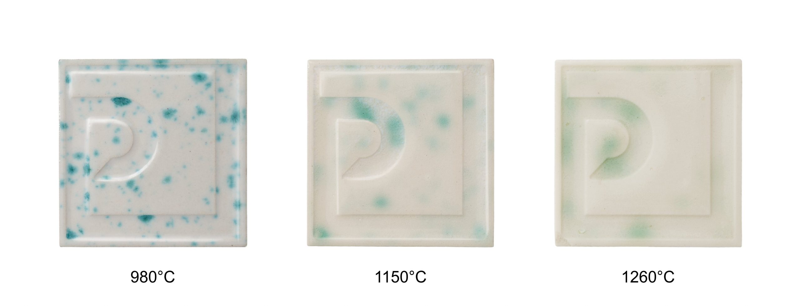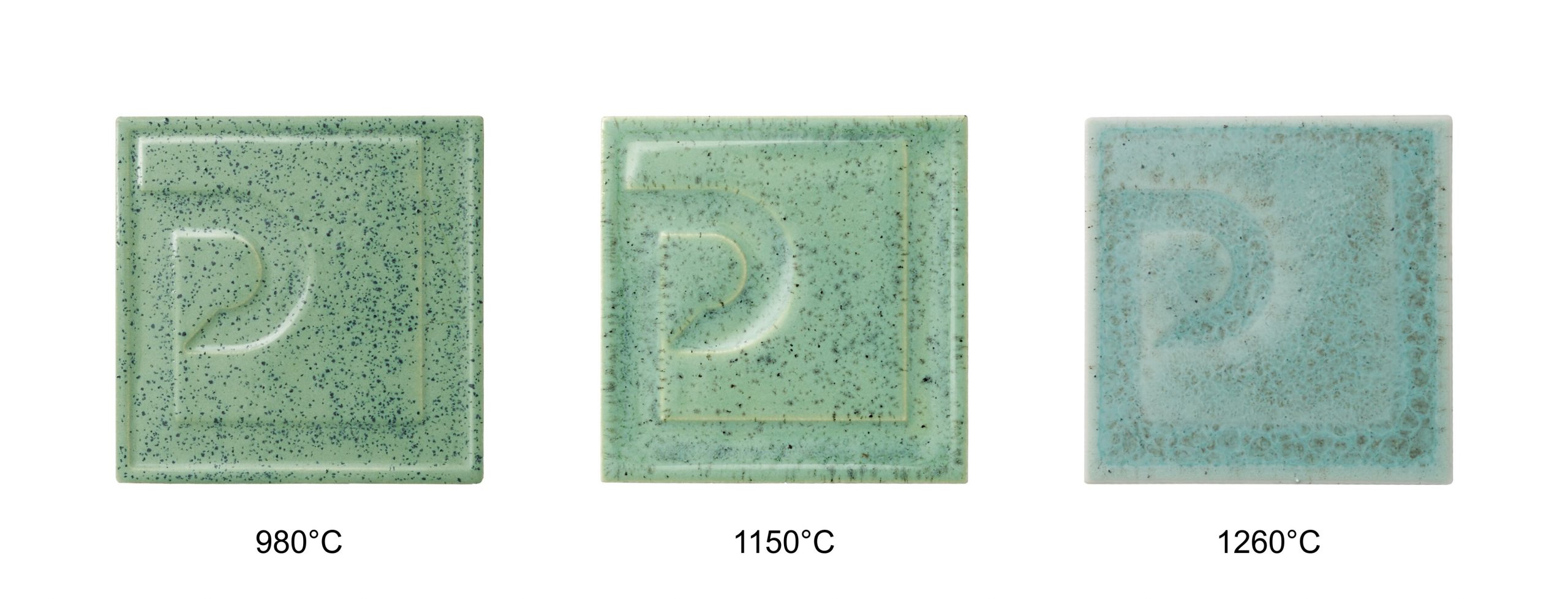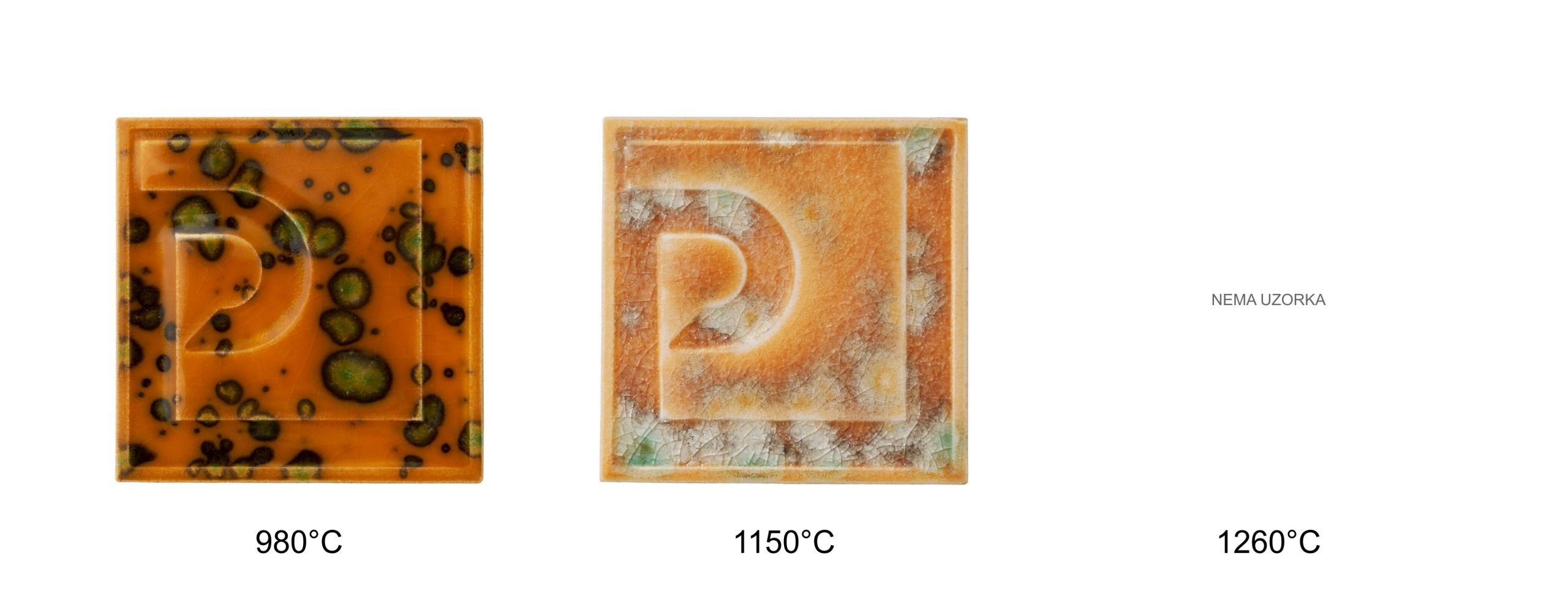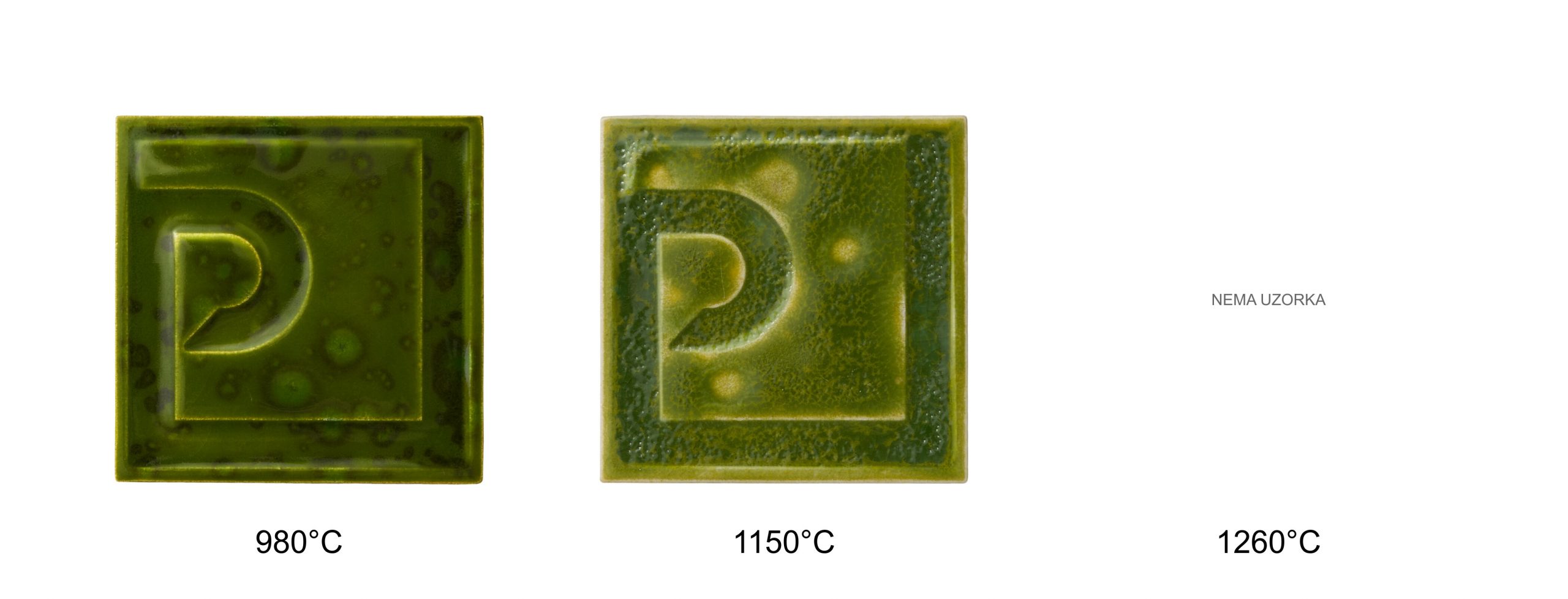 Osnovni raspon pečenja iznosi 980–1080 °C, uz mogućnost promjena efekta na višim temperaturama. Konačni izgled ovisi o podlozi, debljini nanosa i režimu pečenja, stoga se preporučuje probno pečenje.