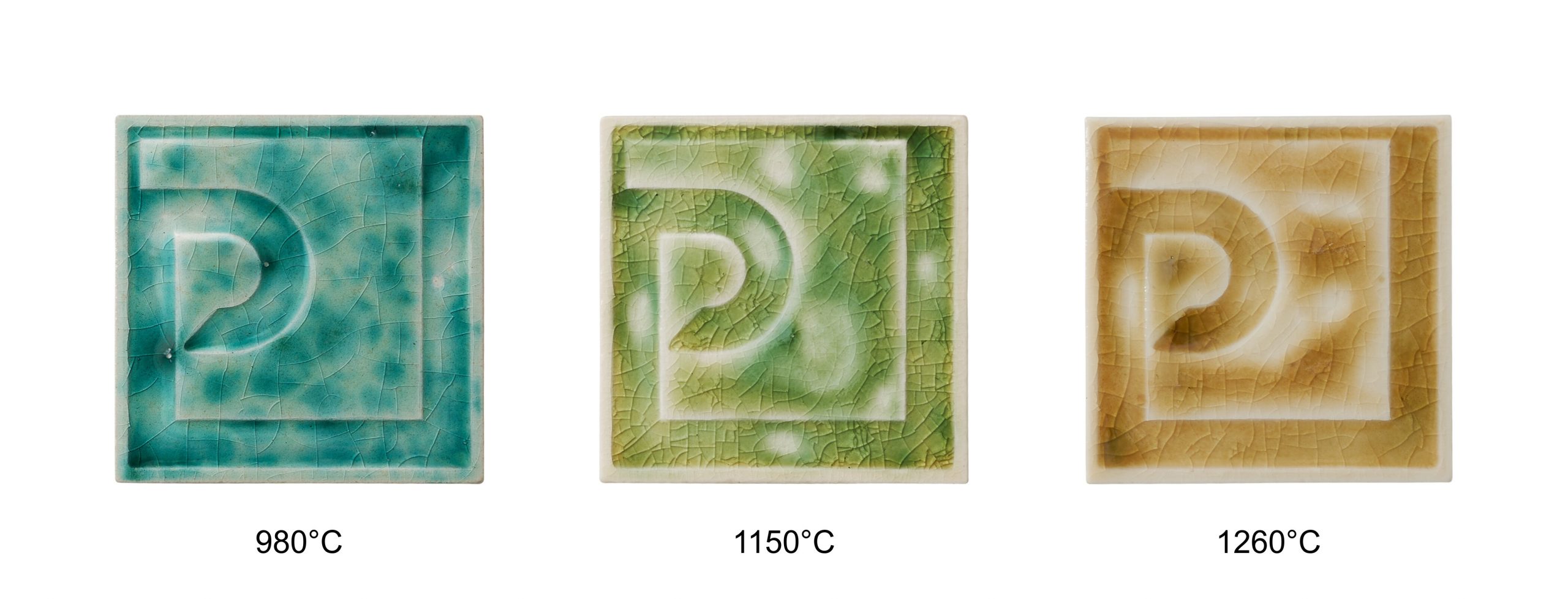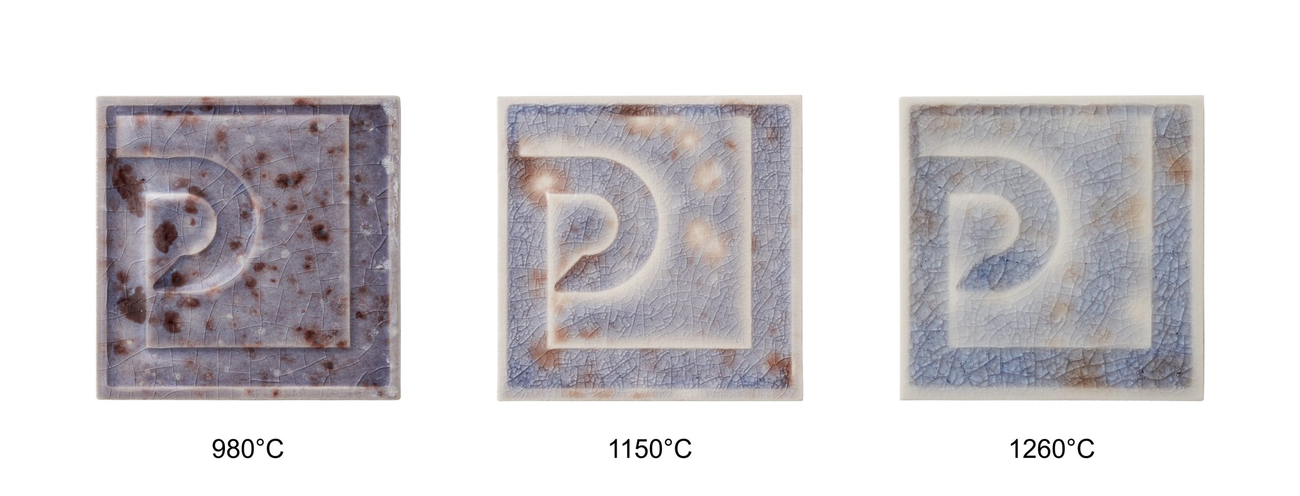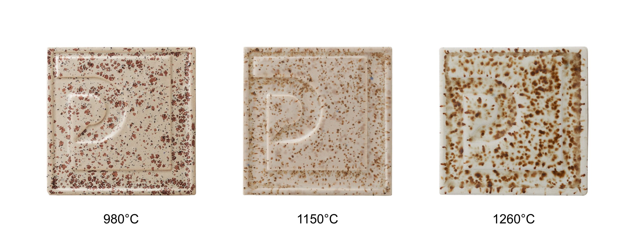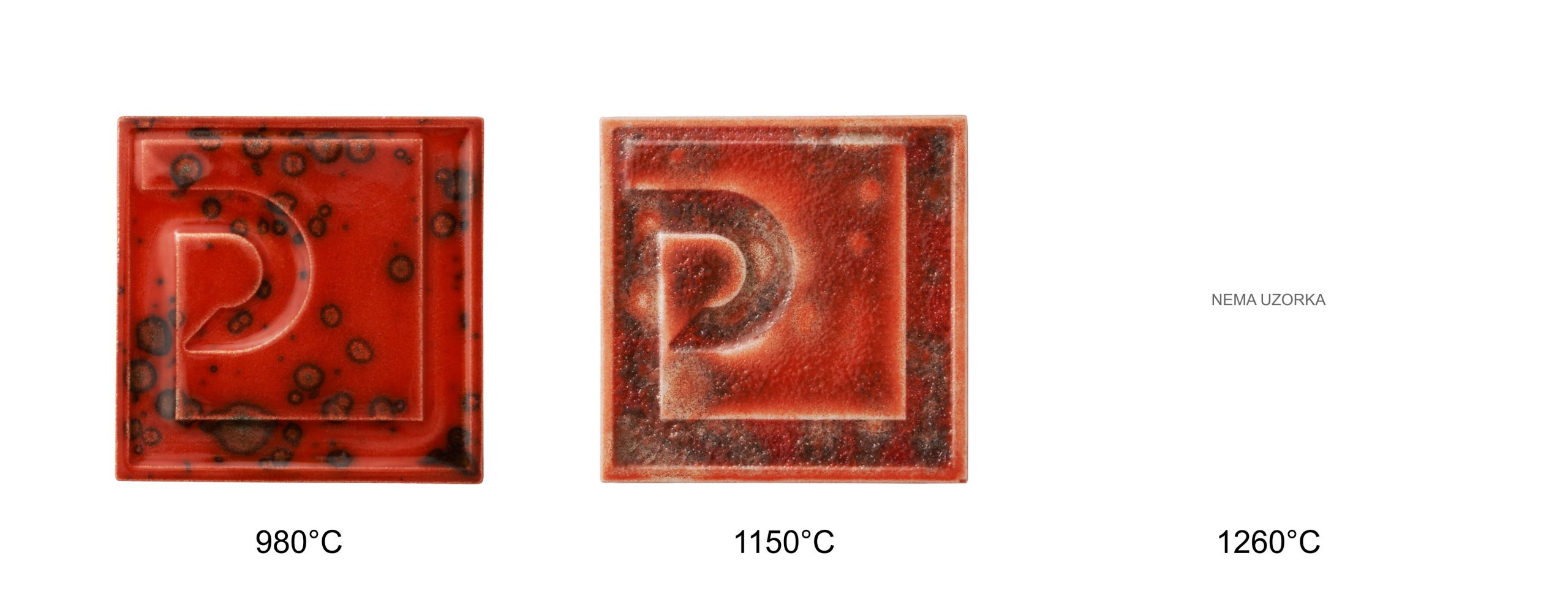 Osnovni raspon pečenja iznosi 980–1080 °C, uz mogućnost promjena efekta na višim temperaturama. Konačni izgled ovisi o podlozi, debljini nanosa i režimu pečenja, stoga se preporučuje probno pečenje.